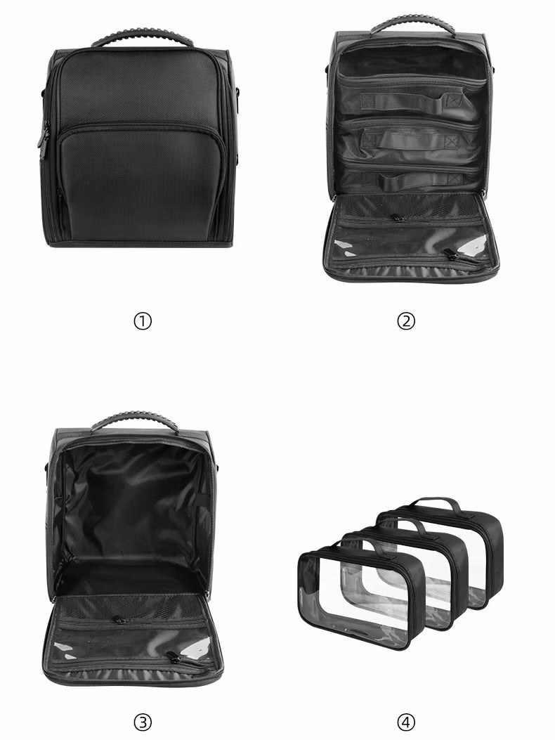 - 3 حقائب صغيرة شفافة لتخزين مستحضرات التجميل والإكسسوارات في الحجرة الرئيسية للحقيبة